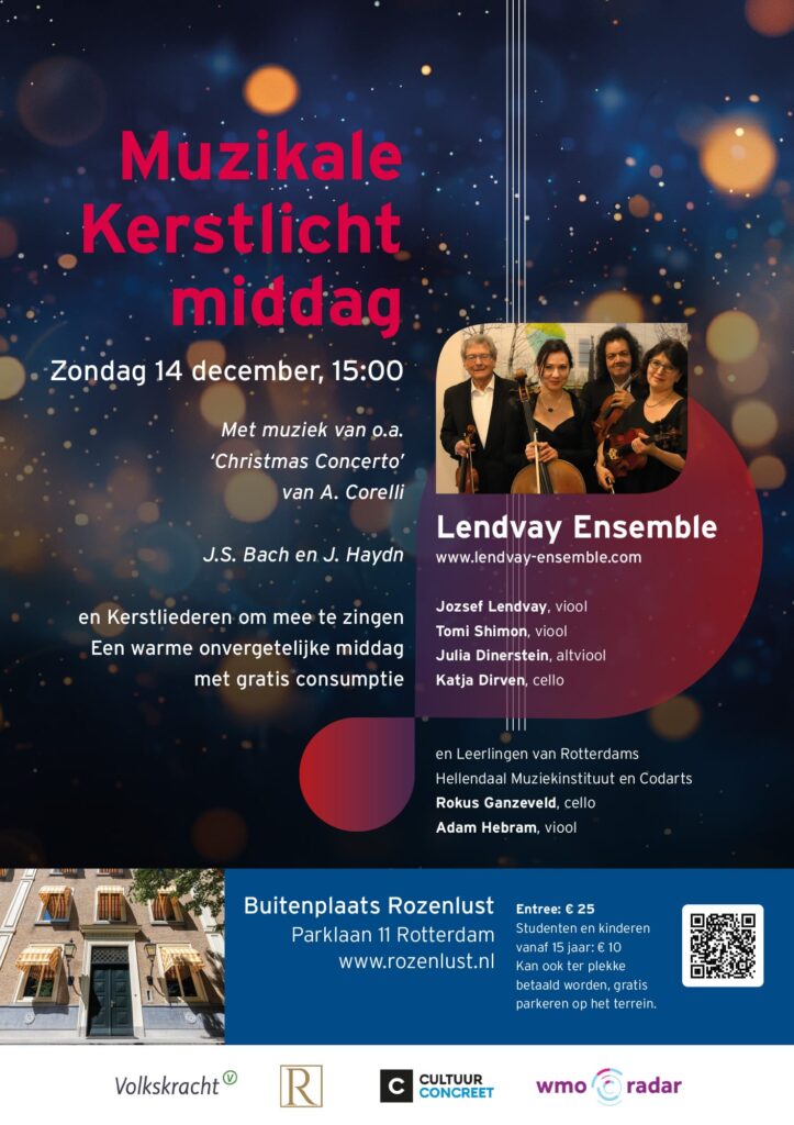 Buitenplaats Rozenlust will be transformed into a warm oasis of light and sound. The Lendvay Ensemble will take you on a musical journey full of Christmas spirit, featuring works by J.S. Bach and J. Haydn, among others.